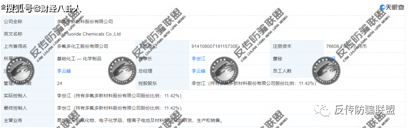 经反传防骗联盟查询,多福源商城背后的上市企业为多氟多新材料股份有限公司,注册资本7.6亿余元,实缴2.2亿余元,法人代表李云峰,但董事长与实控人也均是李世江。