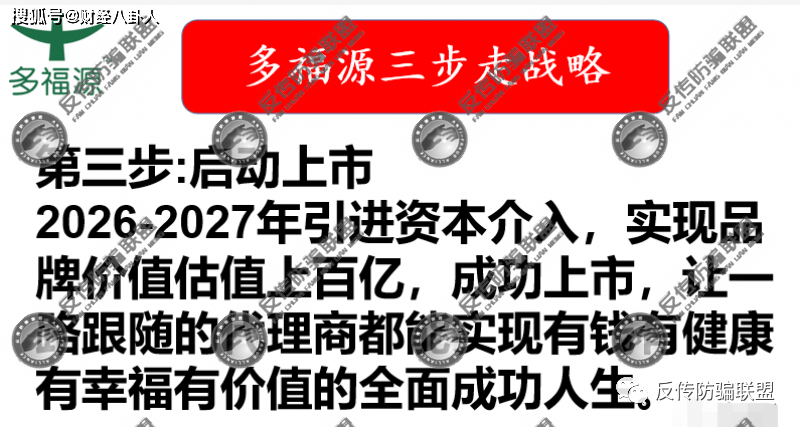 据“多福源”微信公众号的宣传资料显示,多福源商城将在2022年至2027年的5的期间开展三步走战略,最终实现品牌价值估值上百亿并成功上市。