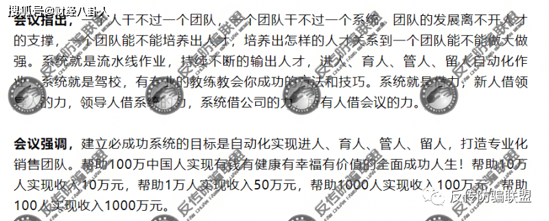 在多福源公司2021年12月召开的全体会议上,平台负责人强调未来要帮助100万中国人实现有钱有健康有幸福有价值的全面成功人生!帮助10万人实现收入10万元,帮助1万人实现收入50万元,帮助1000人实现收入100万元,帮助100人实现收入1000万元。