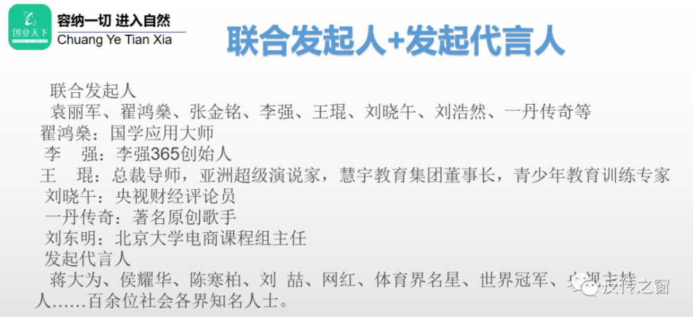 在创业天下的管理层方面,有关PPT介绍称,除了陶国林,还有创业天下联合创始人张必清、石岩、张大春、王慧、袁丽军、翟鸿燊、张金铭、李强、王琨、刘晓午、一丹传奇、徐浩然等人,创业天下的CEO是管子植。