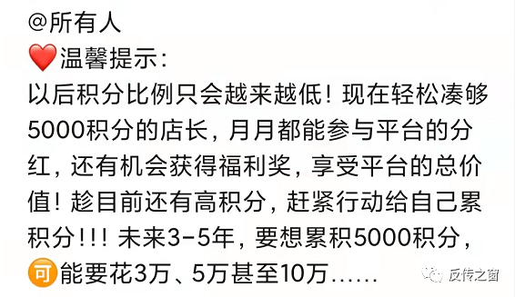 那么这个能让用户心甘情愿地掏钱买这些性价比不高的产品的积分有什么用?据悉,能让用户们变得舍本逐末的这些积分的价值在于累计积分达5000以上,将可以永久参与平台总利润分配的25%分红,这个积分不清零,可累计,积分达到条件的用户每个月可以拿到这份分红,消费积分5000为一星店长,10000消费积分为二星店长,15000消费积分为三星店长,40000消费积分为四星店长,60000消费积分为五星店长,平台方原来是按照“星级”进行分红的,现在则开始按照积分总数进行分红,即按照比例计算,积分多的分得就多,积分少的分得就少。