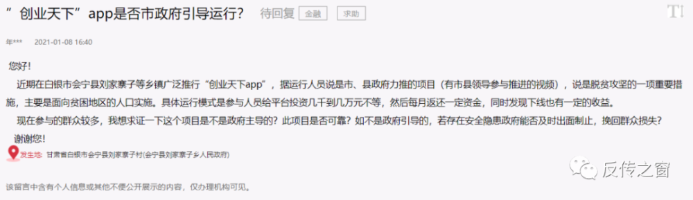 在领导留言板上,也有网友投诉称:“有人于近期在白银市会宁县刘家寨子等乡镇广泛推行“创业天下app”,据运行人员说是市、县政府力推的项目(有市县领导参与推进的视频),说是脱贫攻坚的一项重要措施,主要是面向贫困地区的人口实施。具体运行模式是参与人员给平台投资几千到几万元不等,然后每月返还一定资金,同时发展下线也有一定的收益。现在参与的群众较多,我想求证一下这个项目是不是政府主导的?此项目是否可靠?如不是政府引导的,若存在安全隐患政府能否及时出面制止,挽回群众损失?”截止目前,该留言尚处于“待回复阶段”。