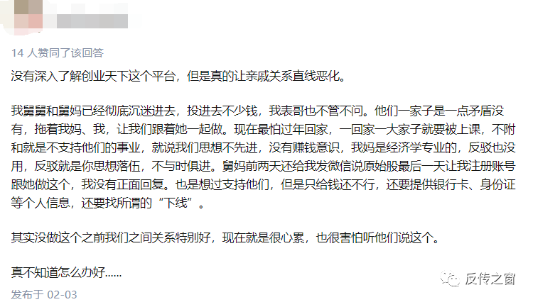 在众多涉及到创业天下的质疑声中,关于亲人受骗的留言令人印象深刻是一个有关舅舅和舅妈的案例。